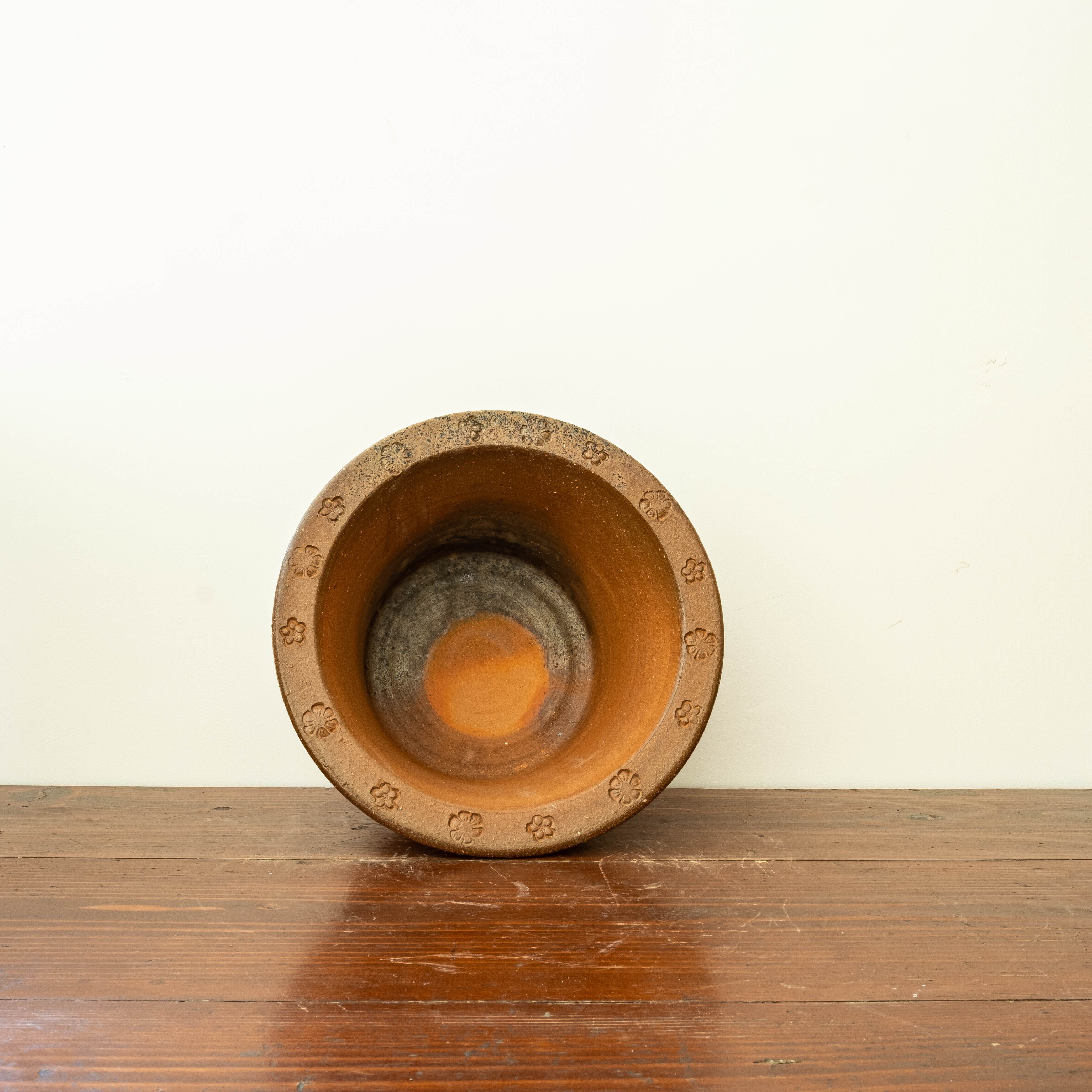 片面は焚き口付近で薪が当たっていた為に変化のあるグレーの発色に、反面は明るい焼け色になっています。口縁部の花柄のスタンプが可愛いアクセントとなっています。